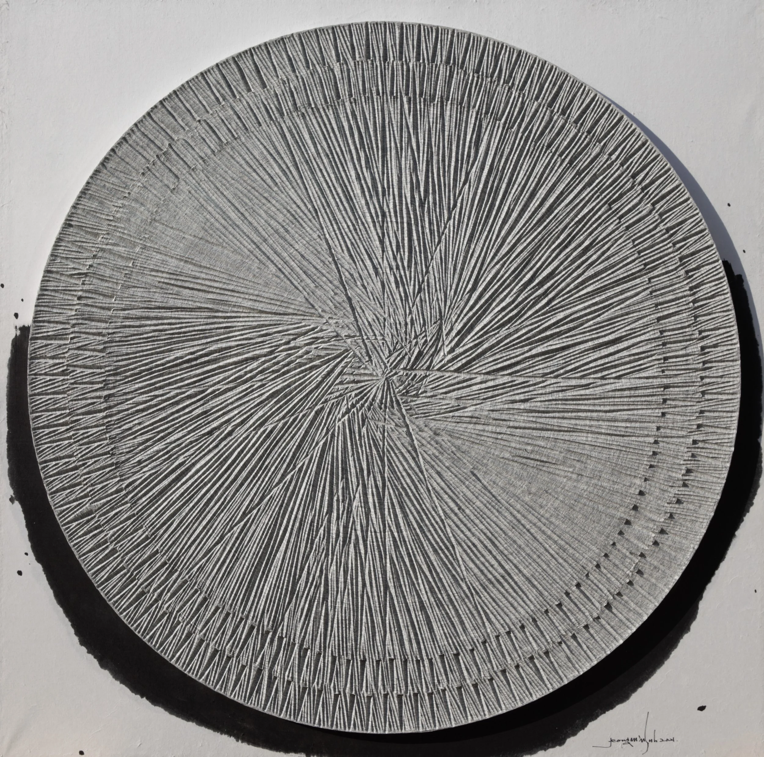 Suh Jeong Min (b. 1962) uses Korean hanji paper made from the bark of Mulberry trees to compose geometric works that oscillate between painting and sculpture while being neither. Suh meditates on the synchronicity, rhythm and the spontaneous chaos of nature that becomes a divine pattern and is the idiosyncratic aesthetic of his work.